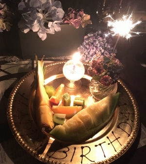 フルーツの盛り合わせを中心に、花火とメッセージで盛り上げます。
