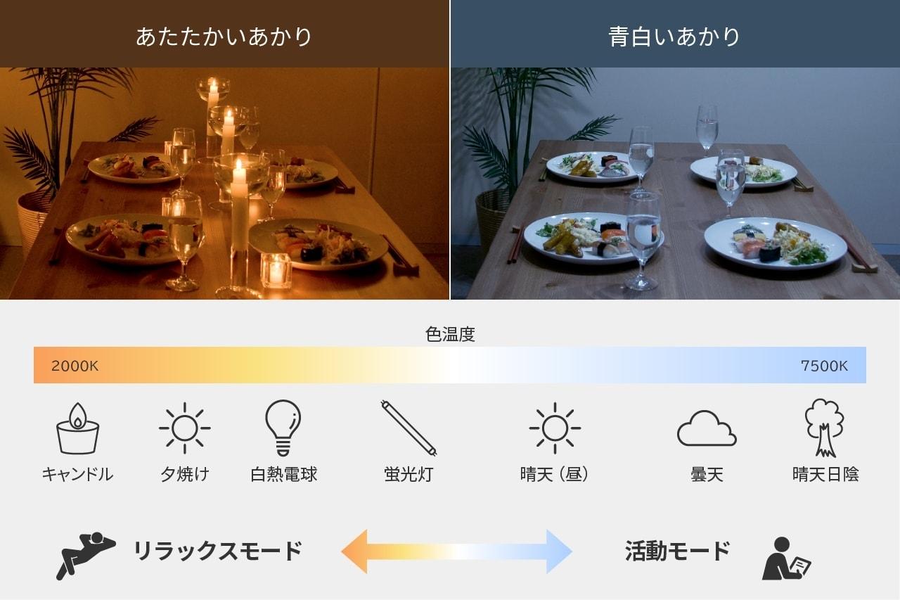 色温度が低いと光は赤っぽく、色温度が低いと光は青っぽくなります。