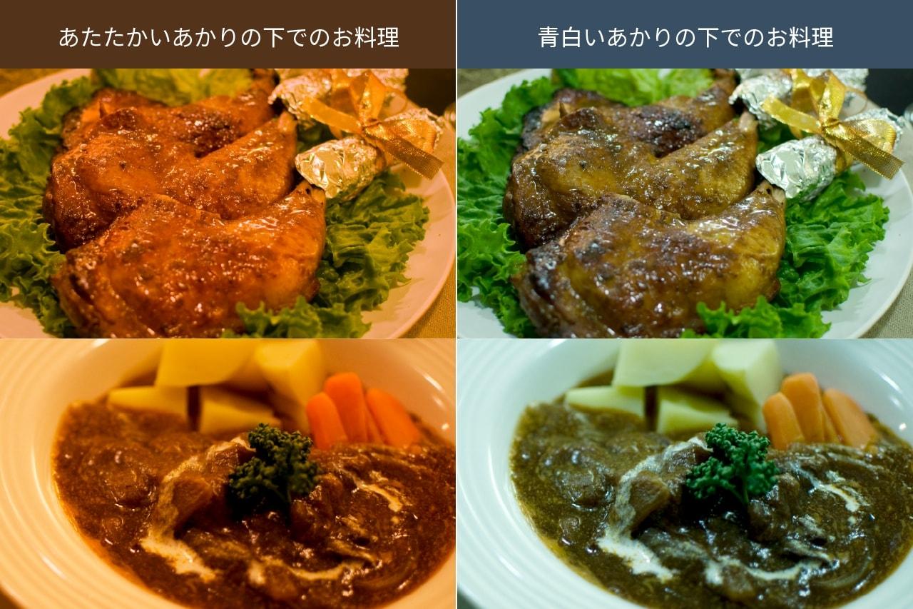 蛍光灯の光の下では、赤い色味のものが青みがかって見えてしまい、味は変わらなくても美味しくないように感じてしまうことさえあります。