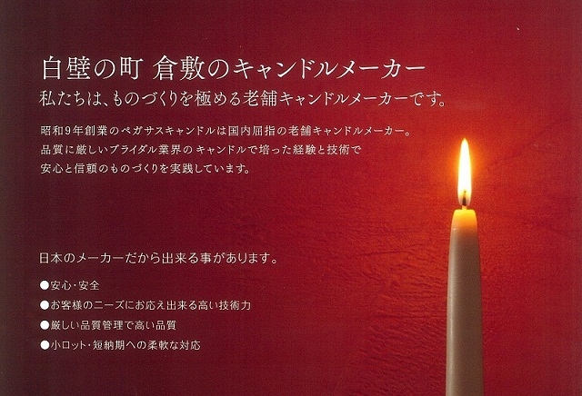 神様、仏様や人の心に通じる燈火(ともしび)を私たちは作らせていただいています。また、キャンドルの新しい使用シーンを提案できることは、人々に幸せをお届けできる大きな喜びでもあります。これが市場創造の原動力であり、ペガサスキャンドルが一番力を発揮できて、仕事も楽しく自分たちの誇りです。