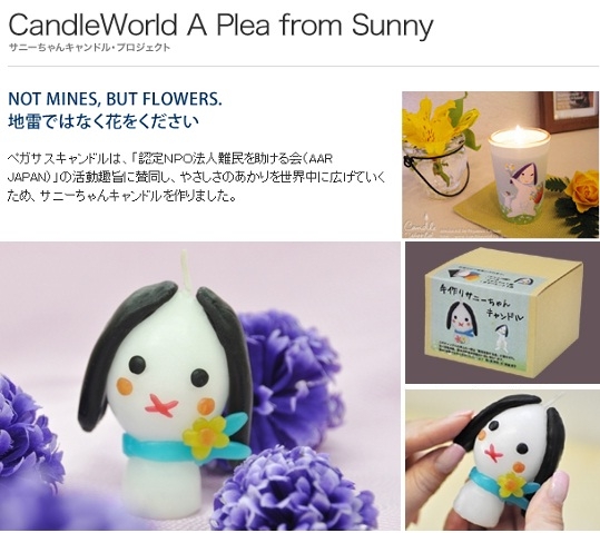 『手作りサニーちゃん』キャンドル販売の収益は、「認定NPO法人難民を助ける会(AAR JAPAN)」に寄付されます。「認定NPO法人難民を助ける会(AAR JAPAN)」は、対人地雷廃絶、難民や障害者支援などの活動をしています。