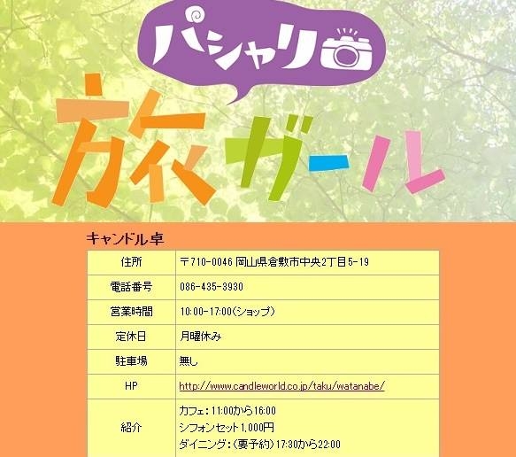TOP お知らせ一覧 2月6日(金) テレビ新広島「ひろしま満点ママ」にて「キャンドル卓 渡邉邸」が紹介されました INFORMATION お知らせ 2月6日(金) テレビ新広島「ひろしま満点ママ」にて「キャンドル卓 渡邉邸」が紹介されました 2015.02.12 テレビ テレビ新広島「ひろしま満点ママ」 2月6日放送の 素敵くらしきパシャリ旅のコーナーで 「キャンドル卓 渡邉邸」が紹介されました。 お知らせ一覧に戻る