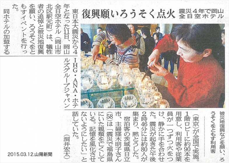 TOP お知らせ一覧 山陽新聞「3・11追悼キャンドルイベント 岡山全日空ホテル」が掲載されました INFORMATION お知らせ 山陽新聞「3・11追悼キャンドルイベント 岡山全日空ホテル」が掲載されました 2015.03.21 新聞 東日本大震災4年『追悼と復興への願い』 岡山全日空ホテル キャンドルの灯りに想いを託して・・・ ANAホテルズグループ・ジャパンの全国で実施されました。 岡山全日空ホテルでも3月11日 「ピラミッドシャンデリア」にキャンドルグラス「スクワッシュ」を使ってキャンドルに灯りが灯されました。 お知らせ一覧に戻る