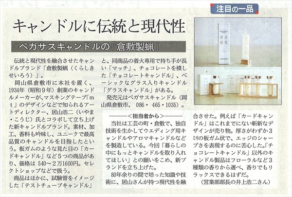 TOP お知らせ一覧 『日経MJ』に倉敷製蠟が掲載されました。 INFORMATION お知らせ 『日経MJ』に倉敷製蠟が掲載されました。 2017.04.17 新聞 4月17日、日本経済新聞社が発行している、消費と流通・マーケティング情報に特化した専門紙『日経MJ』に、倉敷製蠟が掲載されました。 注目の一品として、紹介されています。 『日経MJ』は、流通・サービス業界では圧倒的な支持を集める、日本有数のマーケティング情報紙です。 倉敷製蠟ブランドページ →倉敷製蠟 伝統と現代性が融合したキャンドル オンラインショップ →倉敷製蠟シリーズ|キャンドルワールド お知らせ一覧に戻る