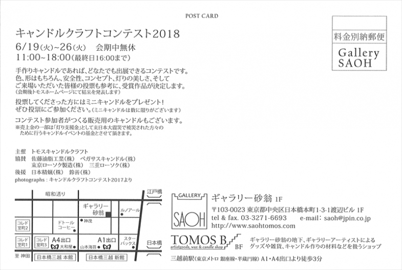 2018年6月19日~26日、東京・日本橋のギャラリー砂翁にて、トモスキャンドルクラフト様による「キャンドルクラフトコンテスト2018」が開催されます。