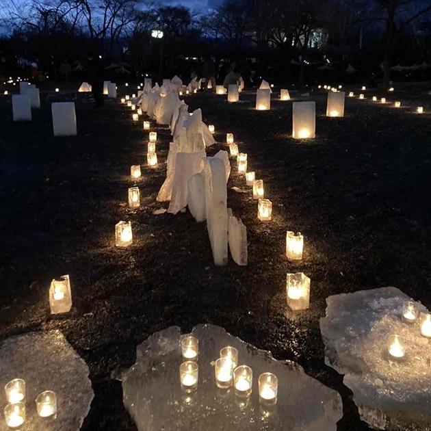 2026年2月7日、氷の器に灯る無数のあかりが、冬の夜の街並みをやさしく照らします。