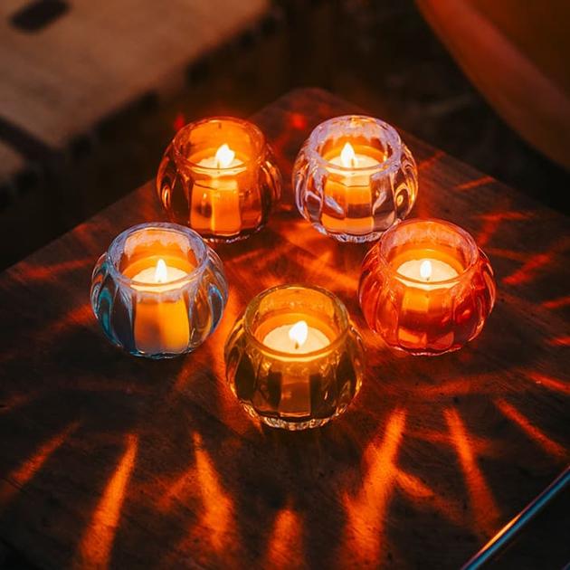 炎に合わせて放射状の光が広がり、テーブルの上にきらめく陰影を映し出します。