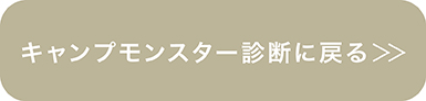 TOP LOOPLE キャンプモンスター診断 PICKUP LOOPLE キャンプモンスター診断 あなたの結果は‥ のんびりモンスター 静けさと癒しを愛する、心穏やかなキャンパータイプ。 景色を眺めながら深呼吸したり、 焚き火やキャンドルの炎を見つめて時間を忘れたり。 周りがバタバタ準備していても、 あなたはマイペースに自然と一体化。 森の小鳥が「のんびりしてるね」と笑っているかも? おすすめLOOPLEギア:アウトドアキャンドル 小ぶりで持ち運びしやすく、 テントやテーブルに置くだけで癒しの雰囲気に。 炎のゆらめきにうっとり…寝ちゃわないでね! NEW アウトドアキャンドル「メダリオン」(アンバー) ¥2,420税込 アウトドアキャンドル「グローブ」(アンバー) ¥2,420税込 アウトドアキャンドル「モザイク」(クラシーク) ¥2,420税込 アウトドアキャンドル「ノワ」(クリア) ¥2,420税込 1