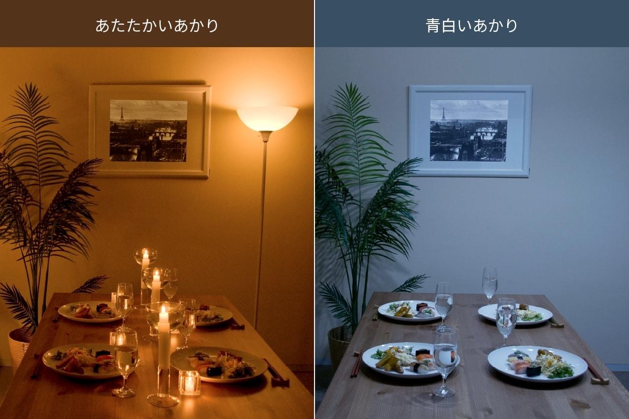 色温度が低いと光は赤っぽく、色温度が低いと光は青っぽくなります。