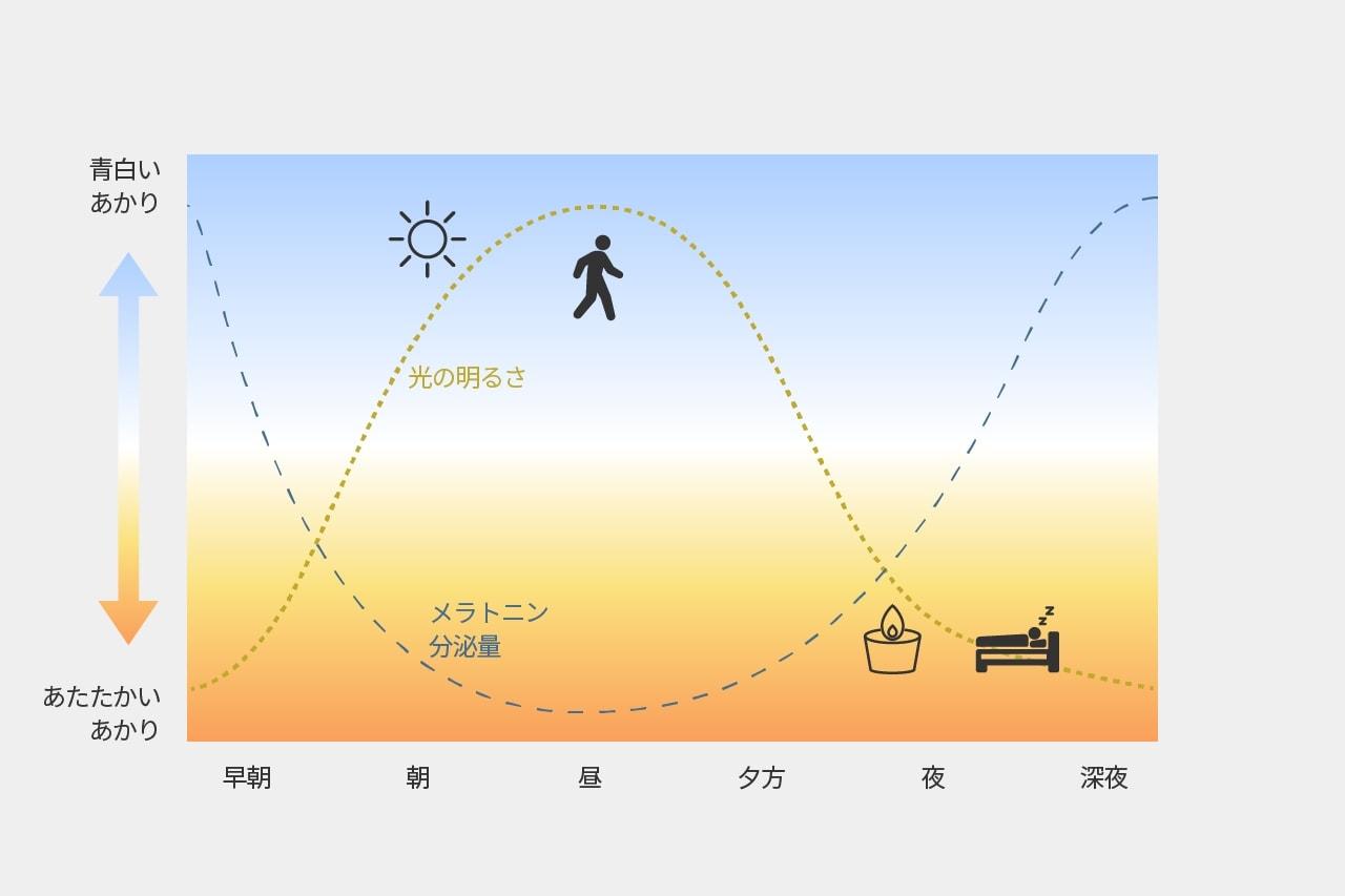 人間の体は、あかりの色や明るさに反応して、活動的になったりリラックスしたりするようになっています。