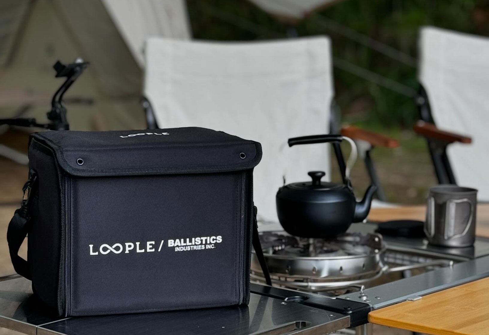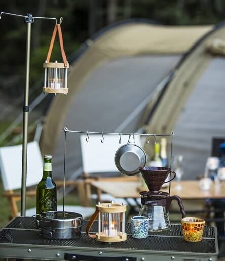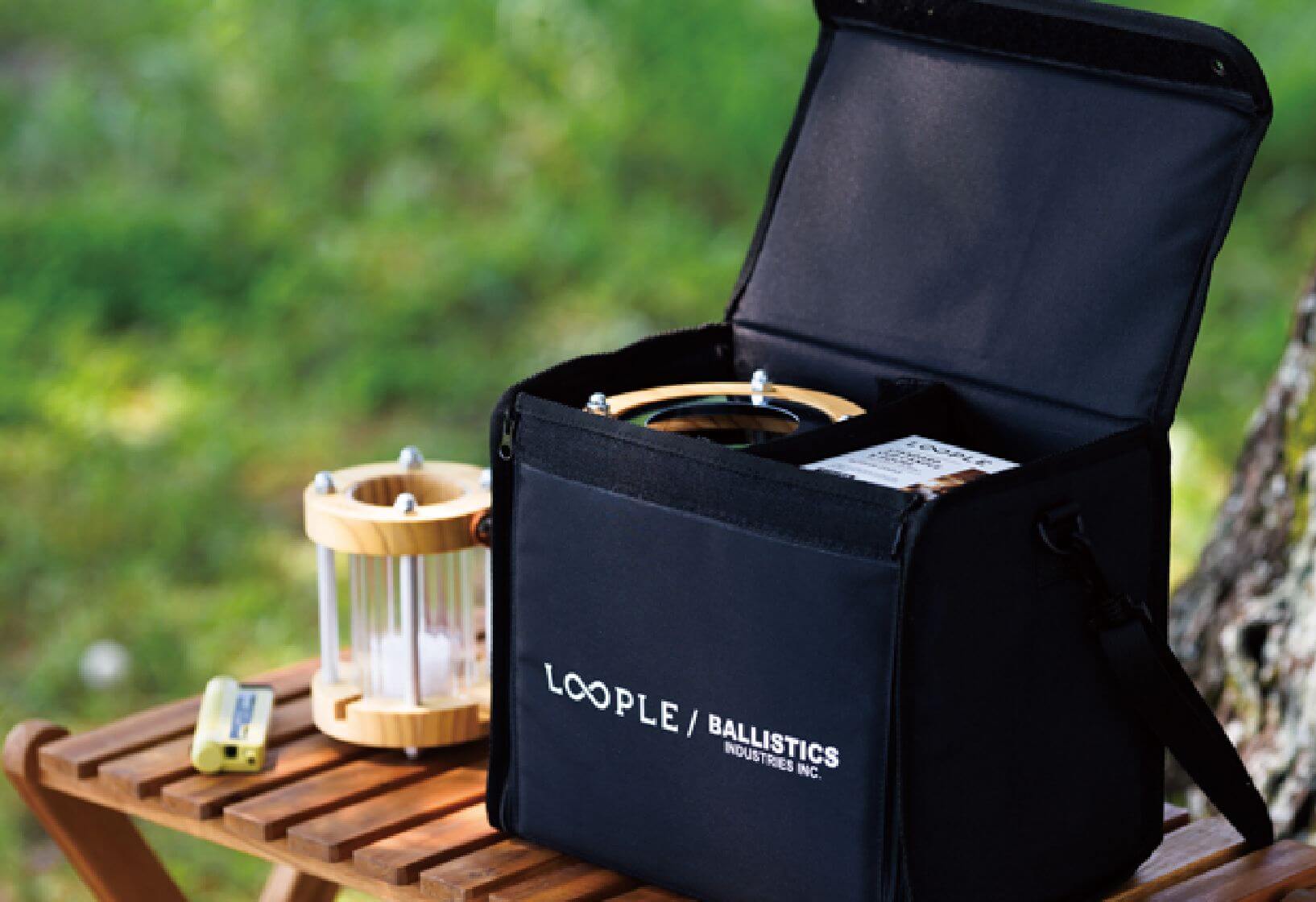昼の明るい時間はキャンプギアとなじむようにデザインや色、素材にこだわったLOOPLE。レイアウトやギアとのコーディネートを考えるのも楽しみのひとつ。